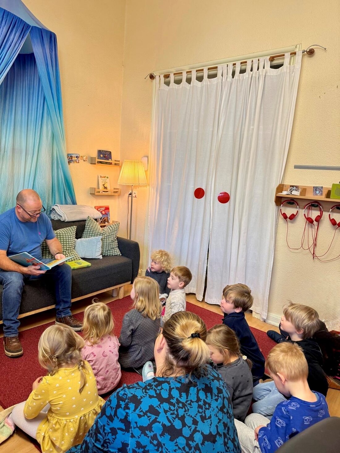 Bild 1: Bürgermeister Stephan Zimniok liest in der Kita Festung Krümelstein.