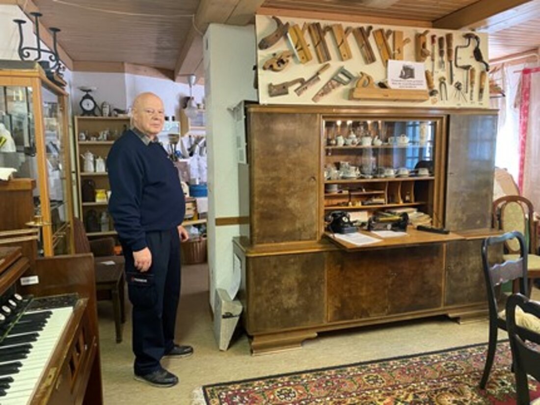 Pünktlich um elf Uhr wurden die Türen der Geschichtsstube an diesem Samstag geöffnet. Bei frühlingshaften Temperaturen und Sonnenschein hofften die Mitglieder des Freundeskreises Geschichtstube auf einige Besucher. In dem etwas versteckt im Untergeschoss des Clara-Zetkin-Haus gelegenen Museums können Gäste einiges zur Geschichte der Gemeinde und ihren Bewohnerinnen und Bewohnern erfahren. Bernd Wiediger, ehrenamtlicher Helfer in der Geschichtsstube, führt die Museumsgäste durch die Räumlichkeiten und weiß viel zu den einzelnen Exponaten zu erzählen. Ein Besucher entdeckt ein Ausstellungsstück, das seine Familie dem Museum überlassen hat. „So hat das alte Stück doch noch einen Wert“, freut sich der Museumsbesucher.