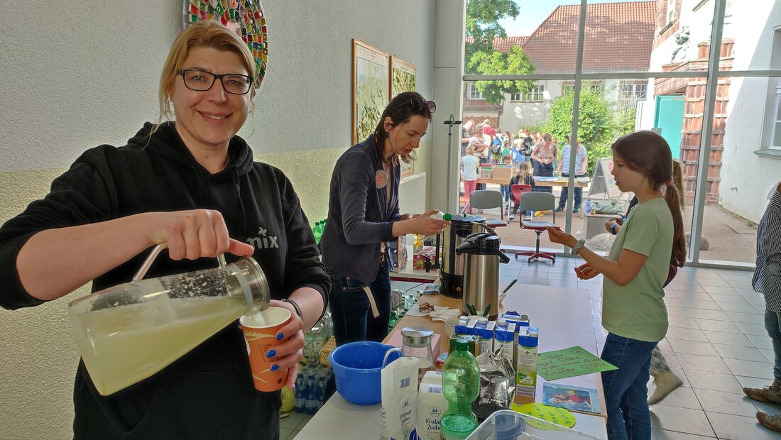 Foto 2: Martina Warning vom Förderverein schenkt selbst gemacht Zitronenbrause ein.