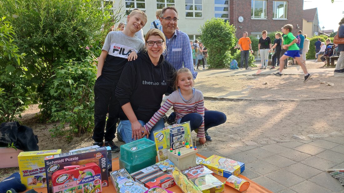 Foto 1: Tag der offenen Tür in der Grundschule Birkenwerder: Martina und Sebastian Warning, hier mit ihren Kindern Lucia (6) und Valentin (9), sind im Förderverein der Schule aktiv.