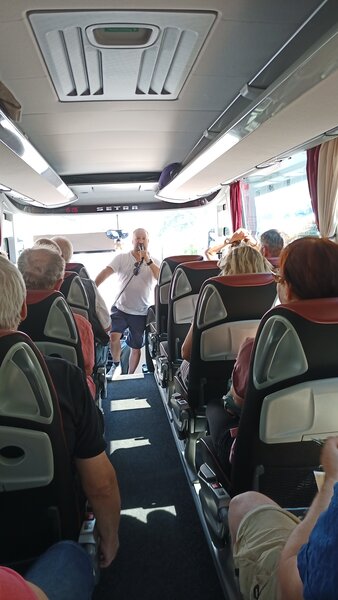 Großer Beliebtheit erfreute sich auch die Bürgermeister-Ortsrundfahrt mit einem eigens dafür zur Verfügung gestellten Bus, gelenkt von Roland Rogge, bei der die aktuelle Entwicklung des Ortes aus der Sicht des Bürgermeisters vorgestellt wurde. Auf dem Weg vom Rathausvorplatz zum Bahnhof, wirbt Stephan Zimniok für die Nutzung der Buslinie 822, auf der sich der Bus gerade befindet. Die Auslastung sei in den letzten zwei Jahren nicht so gut gewesen, wie man sich das vorgestellt habe, so Zimniok. Etwa 25 Gäste hatten die Gelegenheit an der Rundfahrt teilzunehmen. Dabei erfuhren die Teilnehmer, dass Birkenwerder seit Kurzem Mitglied bei Transparency International ist. Weiterhin ging die Fahrt vorbei am Wohnungsbauprojekt Havelstraße-Industriestraße, wo der Bürgermeister die Teilnehmer über den Stand der Bauarbeiten informierte. Auf dem ehemaligen Industriegelände sollen 160 Wohneinheiten entstehen.