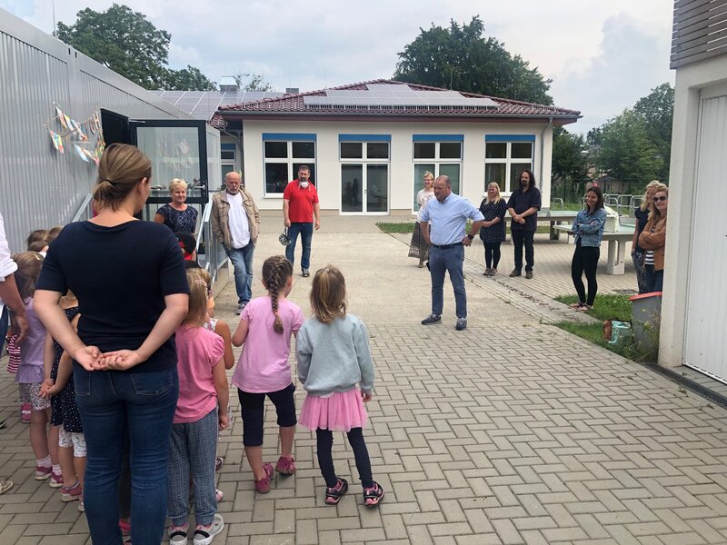 Bild 1 : Bürgermeister Stephan Zimniok wünscht den Kita-Kindern eine besonders schöne Zeit in der neuen Kita.