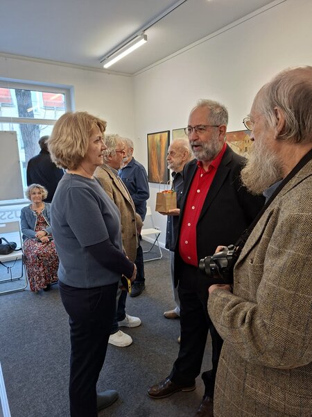 2 Künstler Dieter Gleffe, Redner Klaus-Dieter Hartung und Mitglieder der Galerie im Gespräch