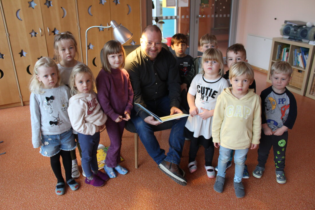 Als der Bürgermeister im Lesesessel Platz nimmt und „Der kleine Drache Kokosnuss – Geheimauftrag Kindergarten“ aufschlägt, ist er sogleich von einer Traube Kindern umgeben, die ihre Gesichter neugierig in Richtung der bunten Seiten halten. Auf die Frage Stephan Zimnioks, wem zu Hause oft vorgelesen werde, recken fast alle Kinder die Hände in die Höhe. „Ein gutes Zeichen“, findet er. Vorlesen legt den Grundstein für eine erfolgreiche Zukunft und ein verständnisvolles Miteinander. Der Bürgermeister unterstützt die bundesweite Aktion gerne. „Lesen ist sehr wichtig, denn das ist der niedrigschwelligste Zugang zu Informationen. „Vorlesen schafft Zukunft“ – so lautet das diesjährige Motto des Aktionstages, zu dem jedes Jahr am dritten Freitag im November DIE ZEIT, die Stiftung Lesen und die Deutsche Bahn Stiftung dazu aufrufen, ein öffentliches Zeichen für das Vorlesen zu setzen.