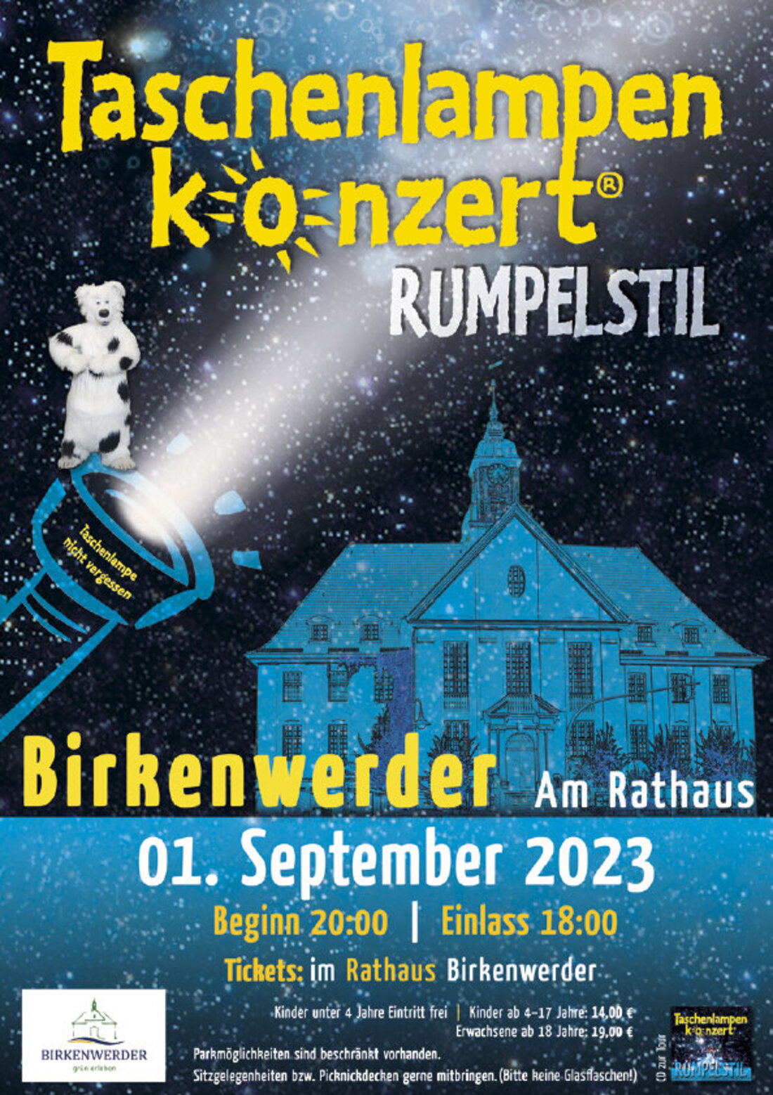 Am 01.09.2023 ist es wieder soweit. Auf der Wiese, gegenüber vom Rathaus Birkenwerder veranstaltet die Gemeinde Birkenwerder zum fünften Mal das Taschenlampenkonzert mit der Band Rumpelstil. Die Karten erhalten Sie ab sofort zu den Sprechzeiten oder nach vorheriger telefonischer Absprache im Rathaus Birkenwerder Zimmer 206 und 207.
