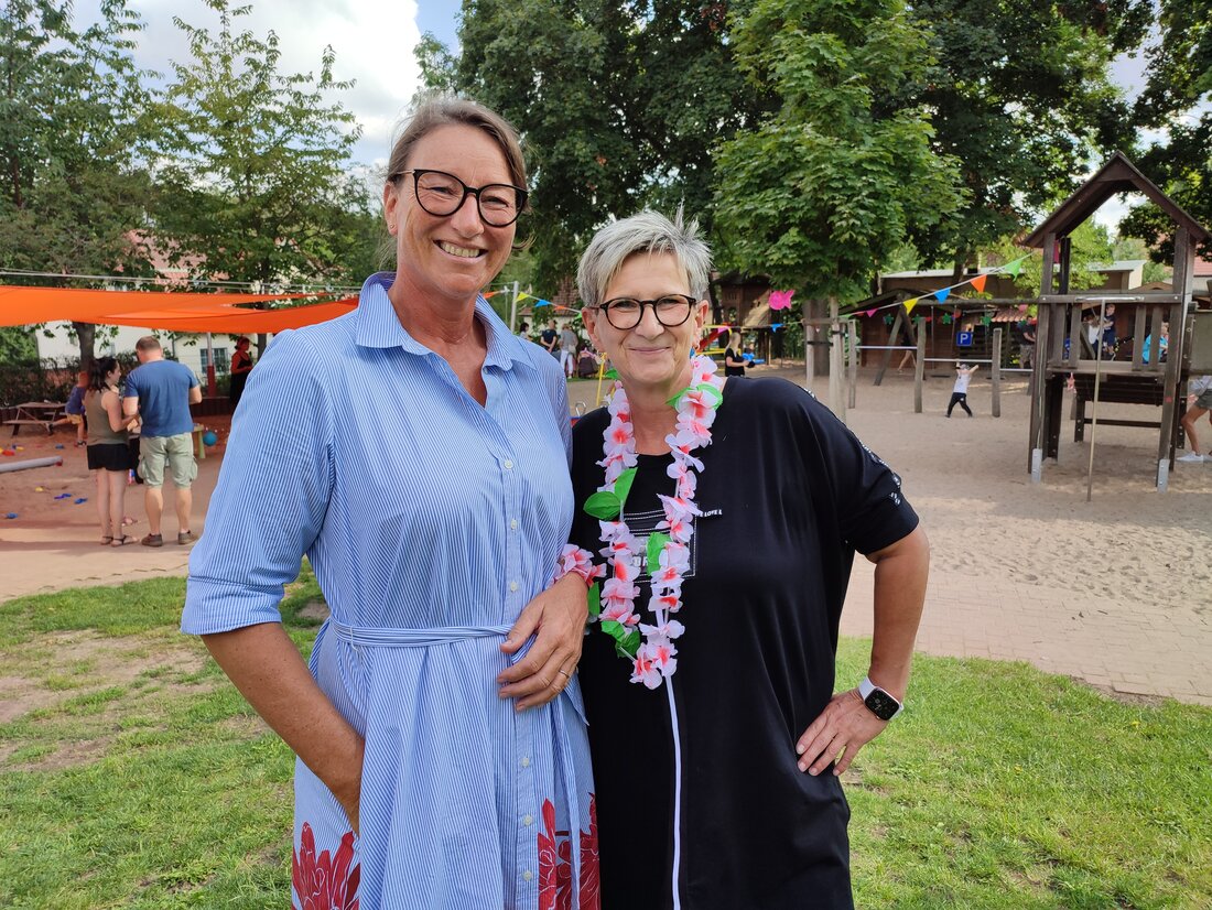 Bild 1: Die Kitaleiterin Susann Unterwalder (l.) mit ihrer Stellvertreterin Marina Wolke auf dem Hof.