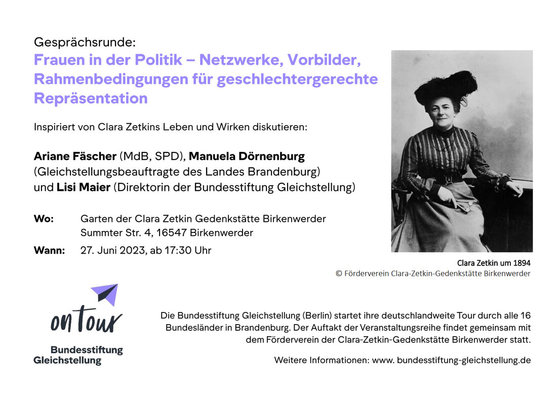 Die Veranstaltung findet in Kooperation mit Ariane Fäscher (MdB, SPD und Mitglied des Stiftungsrates) und Manuela Dörnenburg (Gleichstellungsbeauftragte des Landes Brandenburg) statt. Mit ihnen wollen wir uns gemeinsam die Fragen stellen: Welche Vorbilder haben mich in die Politik begleitet? Welche Frauen inspirieren mich? Welche Netzwerke brauchen Frauen in der Politik?