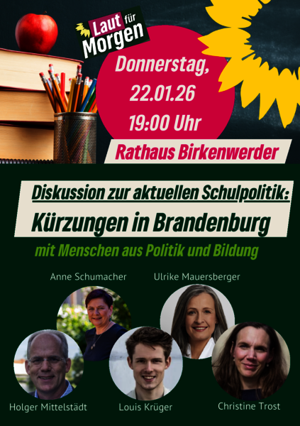Mit einer Podiumsdiskussion zu aktuellen Fragen der Schulpolitik in Brandenburg möchten wir den öffentlichen Dialog stärken und zugleich die Initiative des Landeselternrats „Unterricht statt Ausfall – Verlässliche Bildungspolitik“ unterstützen.